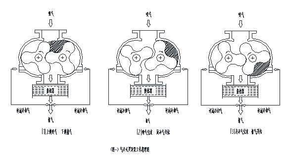 氣冷羅茨泵在工作中,被抽氣體是以垂直上方吸入,垂直下方排出。泵的兩端均有冷卻反氣口,向泵內(nèi)提供冷卻空氣或用冷卻器進(jìn)行冷卻。如(圖一)所示。