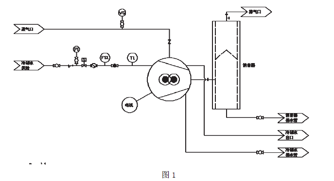 這種裝置是一種風冷裝置,并且冷卻水可以循環利用,離心泵是冷卻水在真空泵到風扇散熱器之間循環。流量指示器、流量開關安裝在冷卻水供應管道處,溫度計(或
